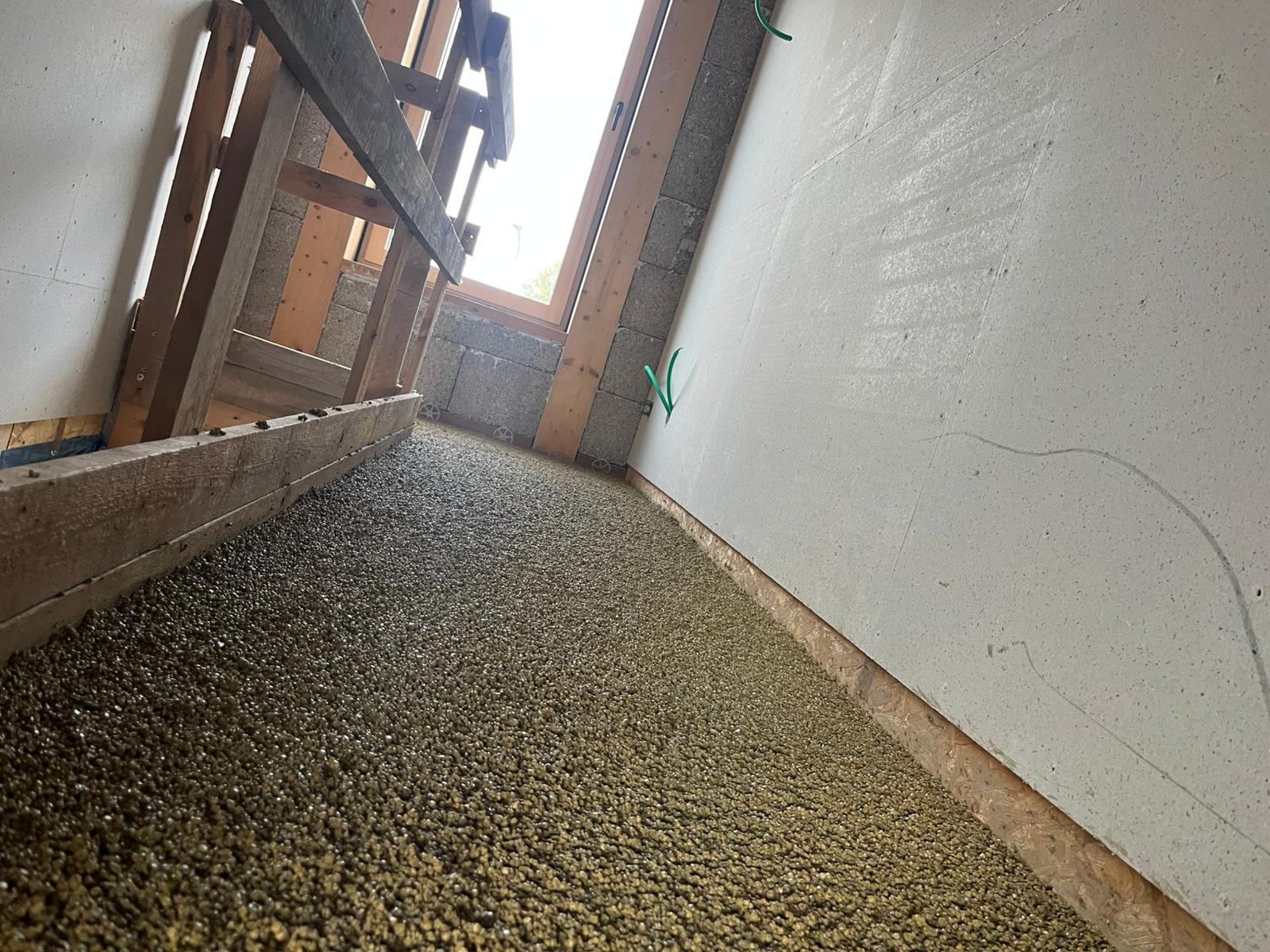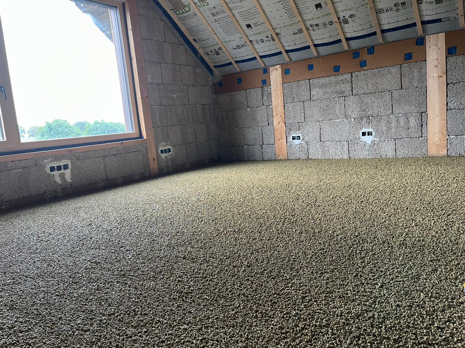 Doordat we weinig water en cement gebruiken, blijft onze isolatie licht. Na het drogen weegt het materiaal tussen 79 en 130 kg per m³ – ideaal voor elke woning zonder extra belasting van de vloer.