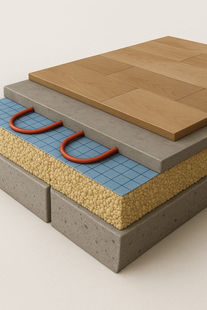 Door de naadloze plaatsing in één enkele laag worden al je leidingen en kanalen perfect omhuld, waardoor koudebruggen verdwijnen en je vloer efficiënt wordt geïsoleerd.