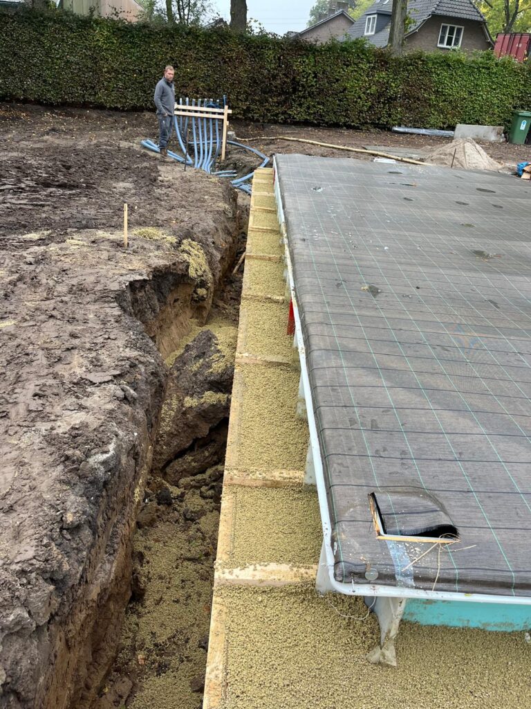 Moet het uitgegraven deel na isolatie nog uitgevuld worden?Dit is niet vereist, aangezien Nivomix-isolatie het uitgegraven gebied rond het zwembad volledig opvult. Na het plaatsen van de isolatie hoeft u alleen nog maar aandacht te besteden aan de deklaag (zoals chape of beton) en verdere afwerking.